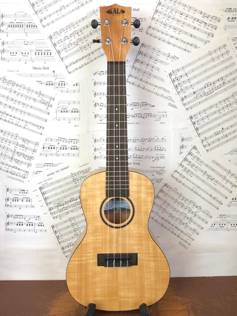 This Kala KA-CEM concert ukulele has a sensational looking flamed exotic laminate mahogany on the top, back and sides. It makes for a beautiful uke you'll surely not want to put down. The sound is very sweet and balanced, with enough headroom to go loud when strummed strong, and retain clarity when picked quietly. So good looks, good sound, good price - good value! Once upon a time, Kala made this model with a very eccentric heavy orange stained finish but we definitely prefer this new understated incarnation with its unstained, light wood look.